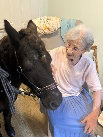 Pepa trotted in with perfectly plaited hair and painted hooves, ready to charm everyone she met. And she did just that. Residents gathered to stroke, feed, and enjoy some gentle one-to-one time with their four-legged guest, who was calm, friendly, and clearly used to stealing the spotlight.